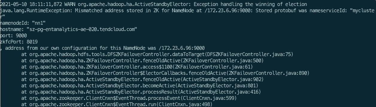 2022-07-20 10:44:32,302 WARN org.apache.hadoop.ha.ActiveStandbyElector: Exception handling the winning of election