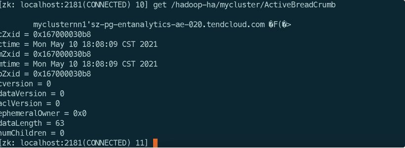 </configuration>配置文件正确,启动后zk中可以查看到/hadoop-ha/mycluster/ActiveBreadCrumb节点信息