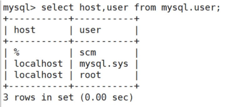 update mysql.user set host='%' where user='scm' and host='localhost';到cm server机器上远程登录这台mysql测试一下是否更改成功