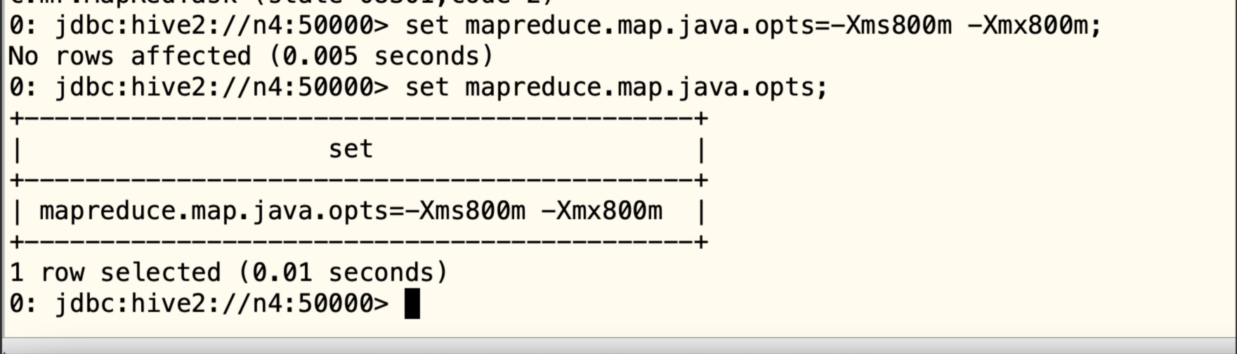 SET mapreduce.map.java.opts=-Xms800m -Xmx800m;