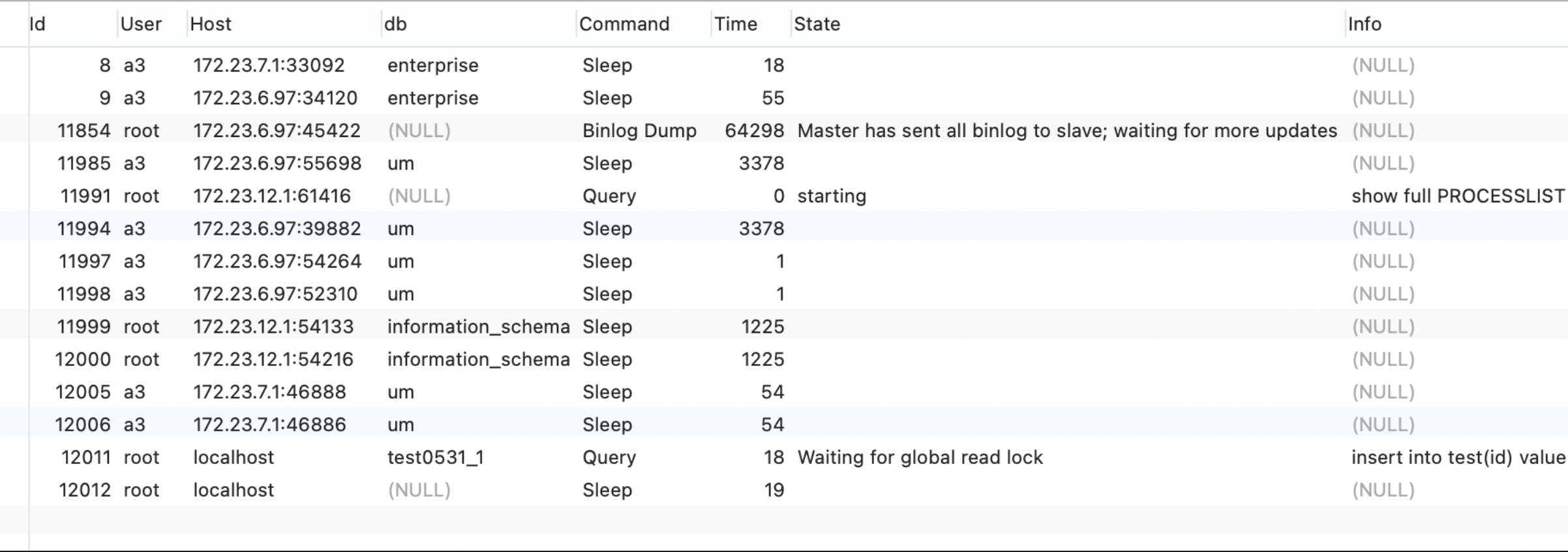 command | 显示当前连接的执行的命令,一般就是休眠(sleep),查询(query),连接(connect) |