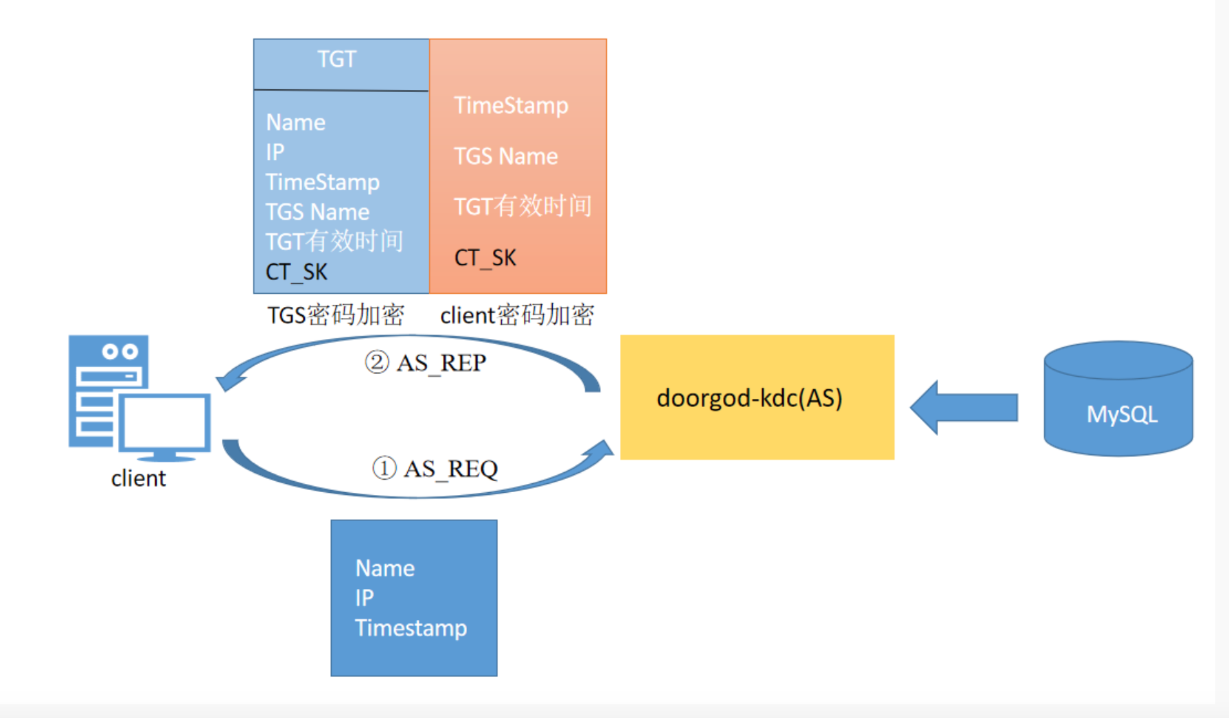 ① 客户端使用CT_SK加密将自己的客户端信息发送给KDC,其中包括客户端名,IP,时间戳;