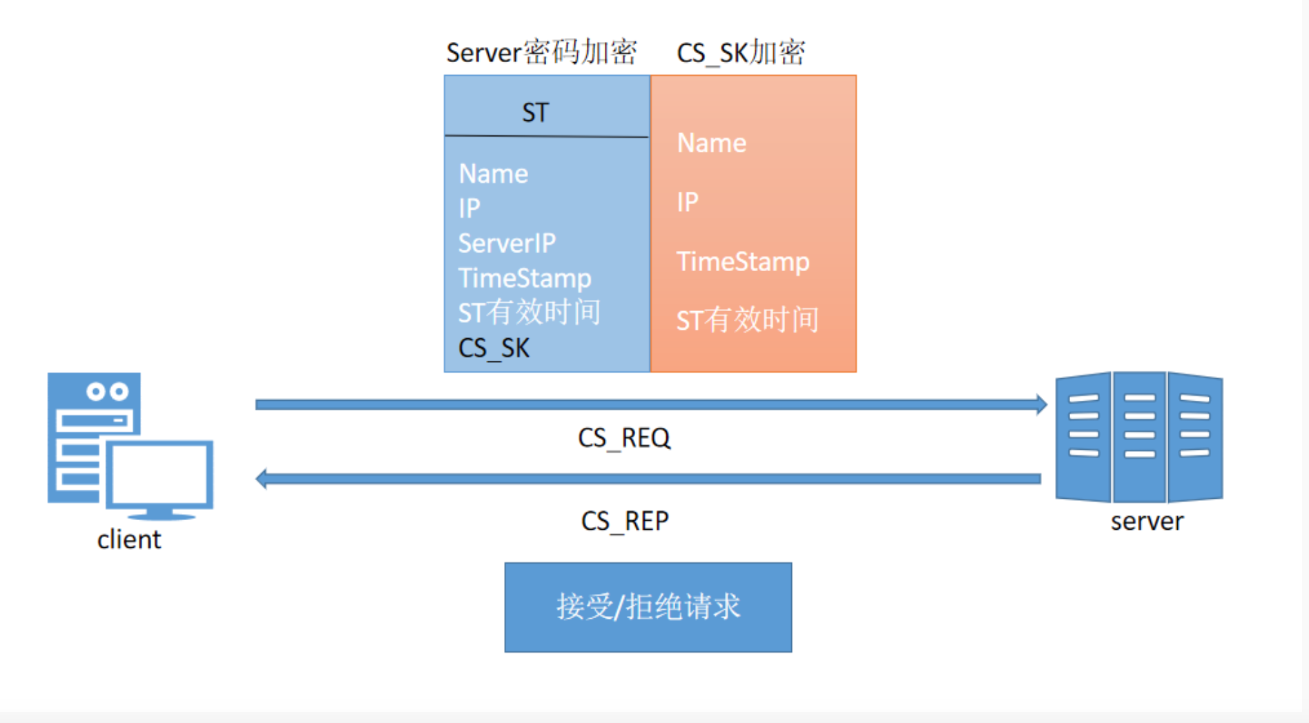 第一部分:用于客户端访问网络服务的使用Server密码加密的ST(Servre Ticket),其中包括客户端的Name,IP,需要访问的网络服务的地址Server IP,ST的有效时间,时间戳以及用于客户端和服务端之间通信的CS_SK(Session Key)。