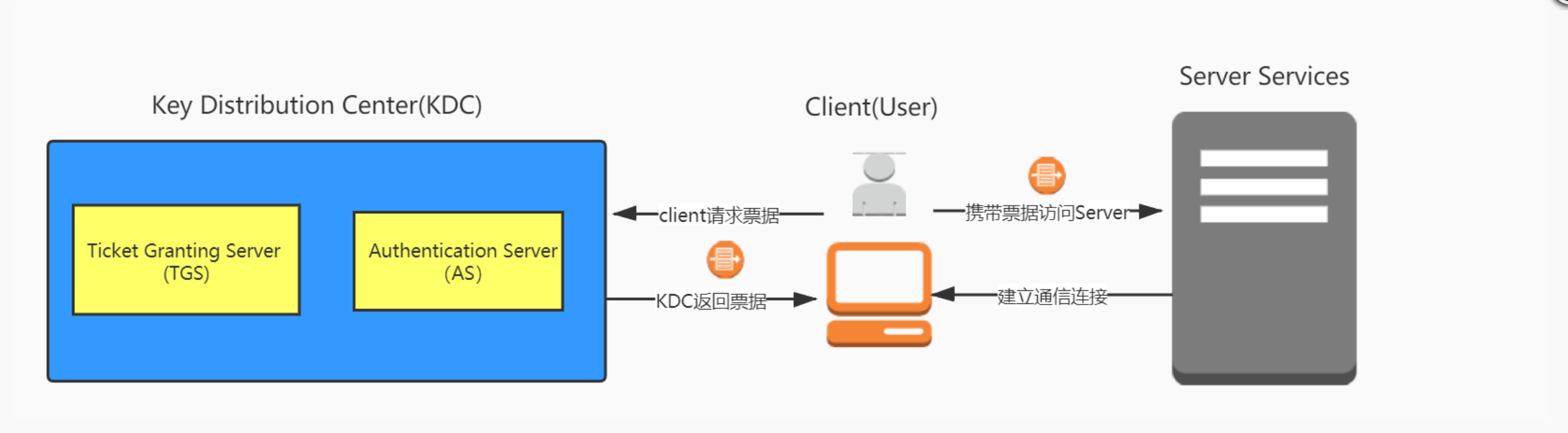 在上面的例子中,A,B分别是客户端和服务端,C担任的角色便是KDC,全称Key Distribution Center,中文名叫做密钥分发中心。KDC中包含一个叫做TGS(票据授予中心)的组件,我们便可以理解为他就是一个发放