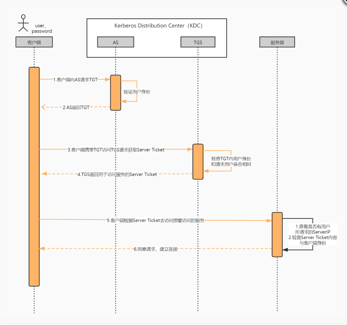 上面说到了kerberos协议当中总共有三个不同的角色,客户端和服务端就不用多说了,一个是请求的发起者一个是请求的接收者,那么KDC是做什么的呢?答案是这样的~